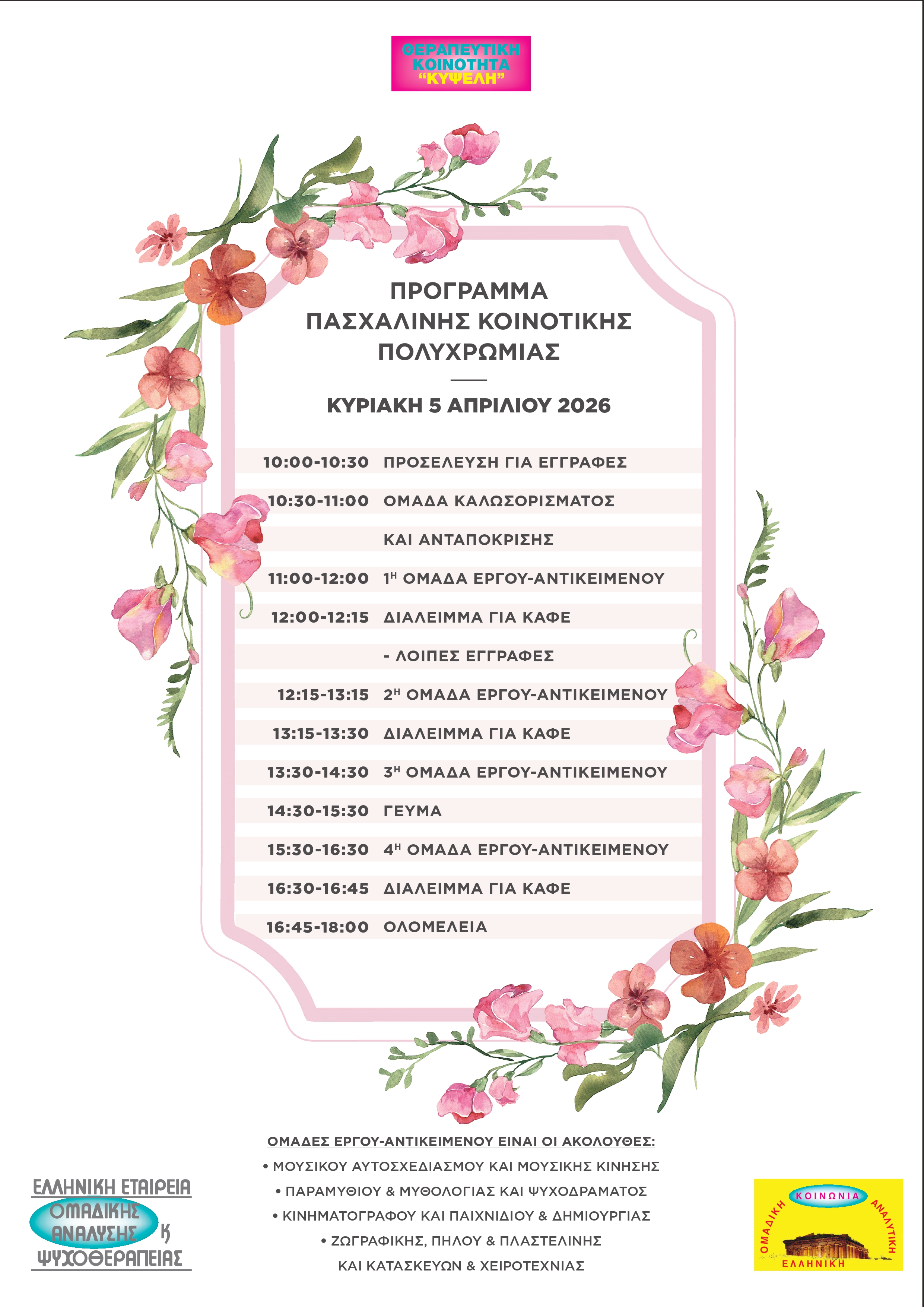 Σας καλούμε στην Πασχαλινή Κοινοτική Πολυχρωμία, η οποία θα πραγματοποιηθεί την Κυριακή 5 Απριλίου 2026 και ώρα 10.00 π.μ. σύμφωνα με το παρακάτω Πρόγραμμα: